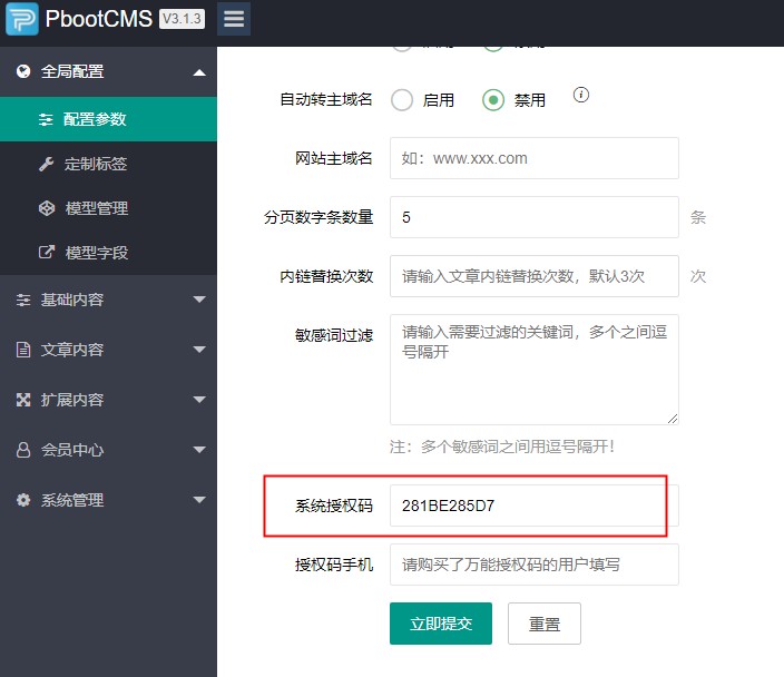 全局配置——配置参数——拉到最下面,系统授权码这里