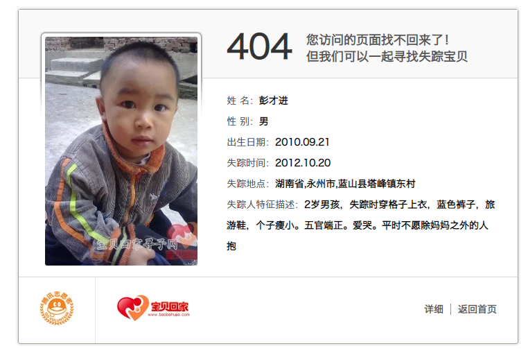 腾讯在很早之前开放了宝贝回家的404页面接口,意味着任何404的网页都可以改为宝贝回家。