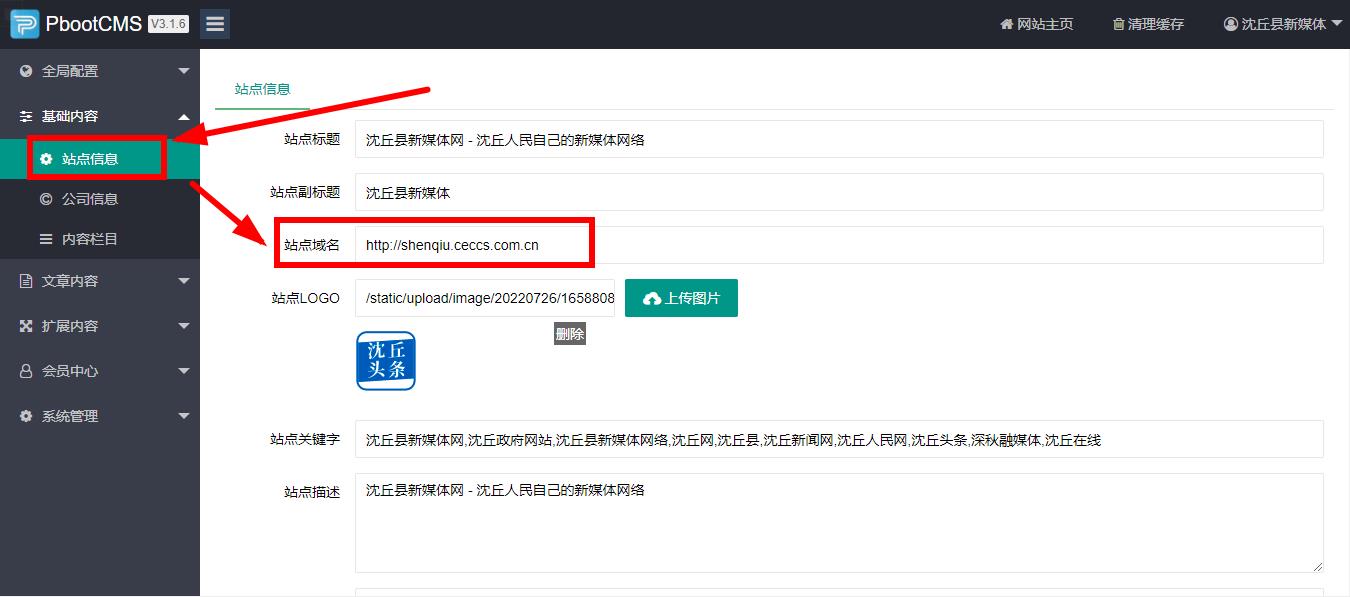 点击左侧菜单:基础内容——站点信息,找到站点域名,填上你的域名,记得http(s)://别忘记加上!