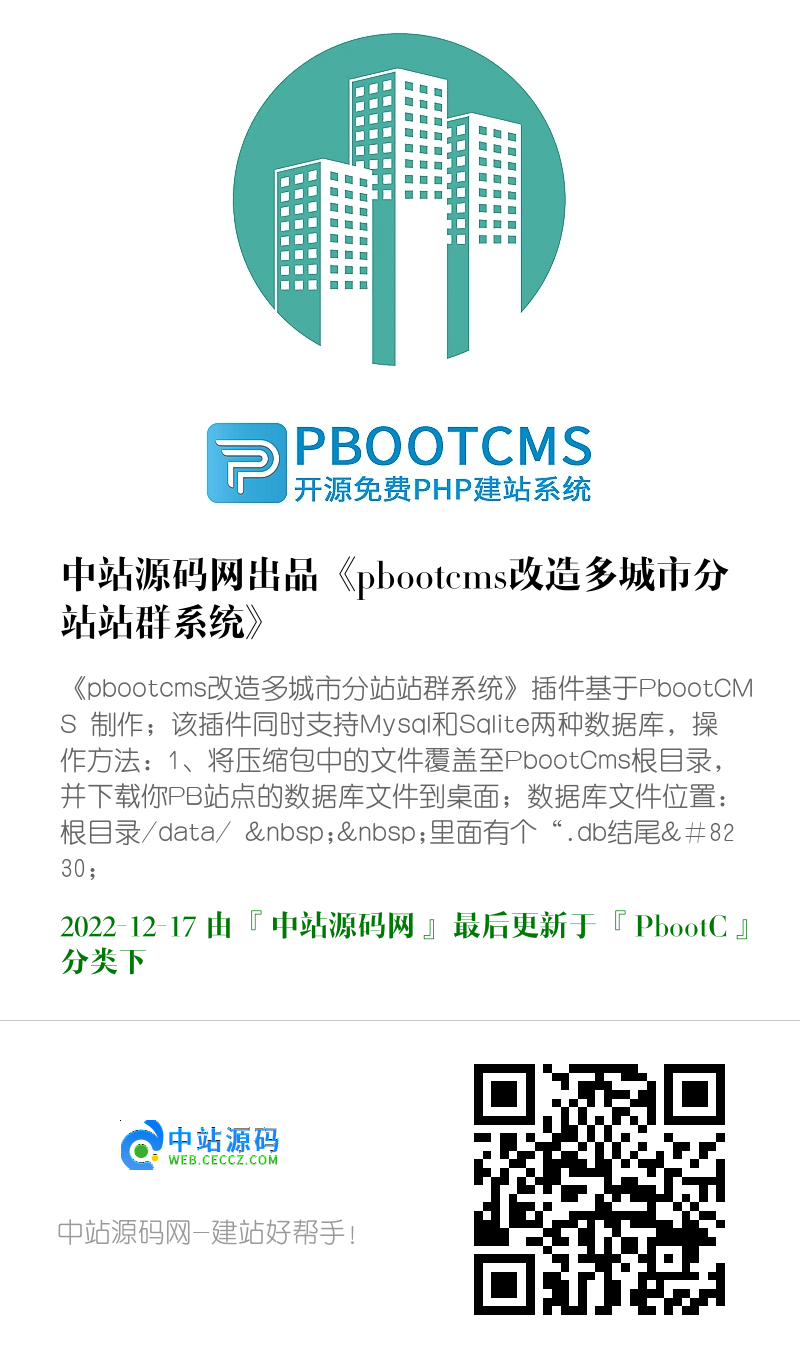 《pbootcms改造多城市分站站群系统》插件基于PbootCMS 制作;该插件同时支持Mysql和Sqlite两种数据库,
