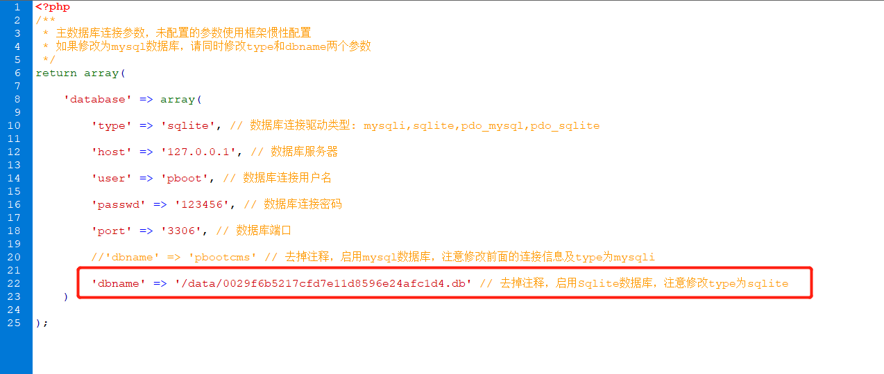 3、更改数据库连接信息:打开根目录下的config文件夹,用html编辑器,编辑database.php这个文件,把里面的data改成刚刚第一步修改的名字,再把这个数据库文件的名字修改成第二步的名字即可。