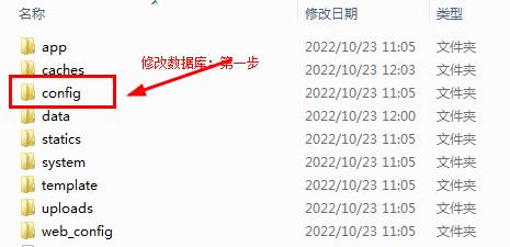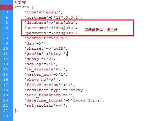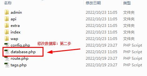 2、找到根目录下的文件夹config,找到database.php文件,用编辑器打开,修改数据库信息;