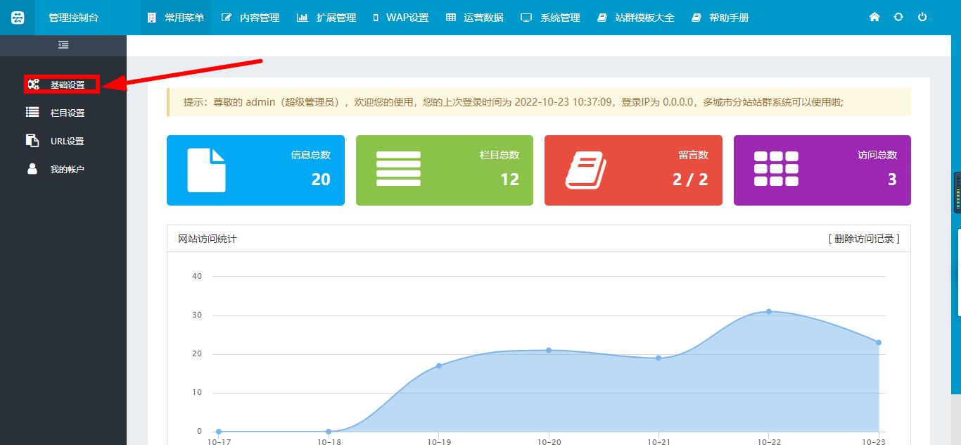 3、修改好后,登录“多城市分站站群系统”后台,浏览器访问:域名/city.php,默认账号admin密码admin;