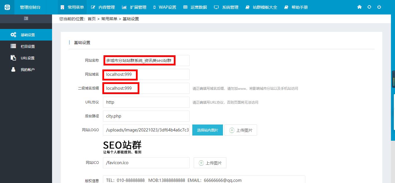 4.1 基础设置里把“网站域名”、“二级域名后缀”修改成自己的域名,记着不要带http://