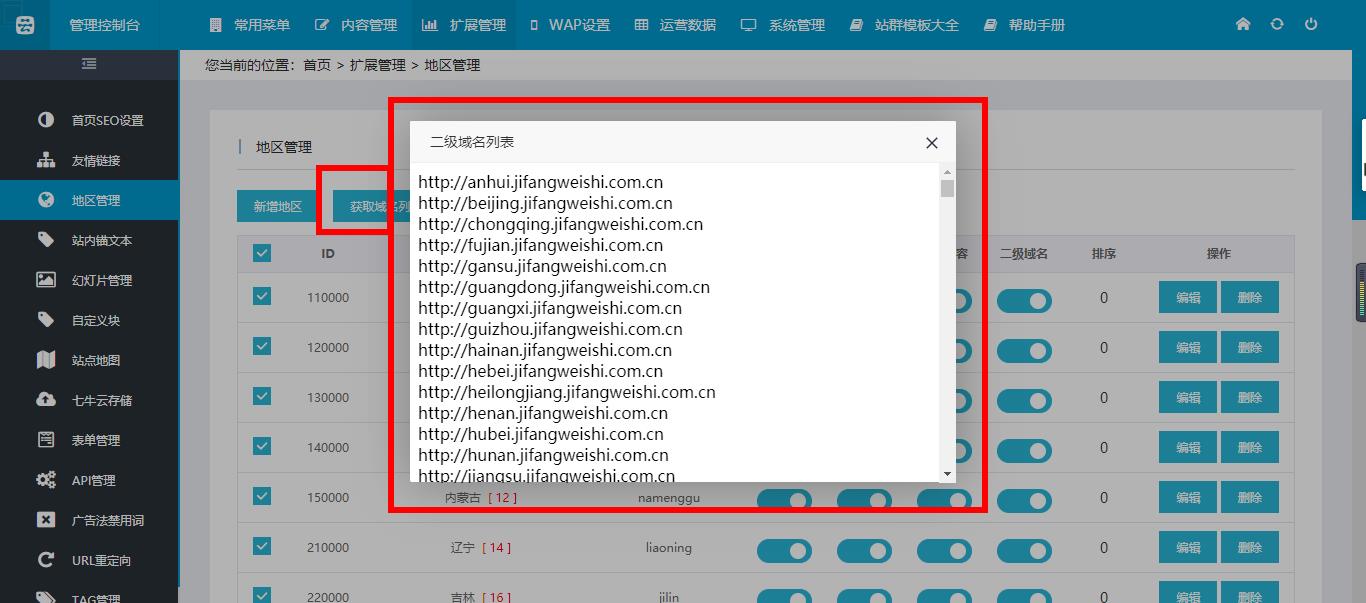 1、在云优CMS1.0.8版本中,我们在地区管理增加了“获取域名列表”功能,如下图所示,点击后会显示所开通的二级域名列表;