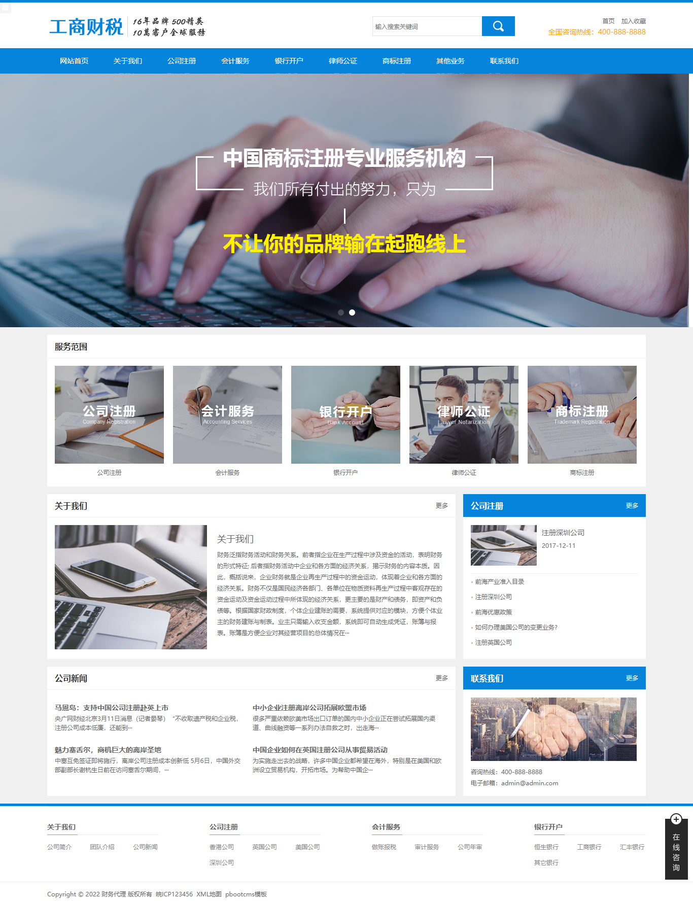 (PC+WAP)公司注册财务会计类网站pbootcms模板 蓝色律师公证网站源码下载PbootCMS内核开发的网站模板,该模板适用于财务会计网站、律师公证网站等企业,当然其他行业也可以做,只需要把文字图片换成其他行业的即可;