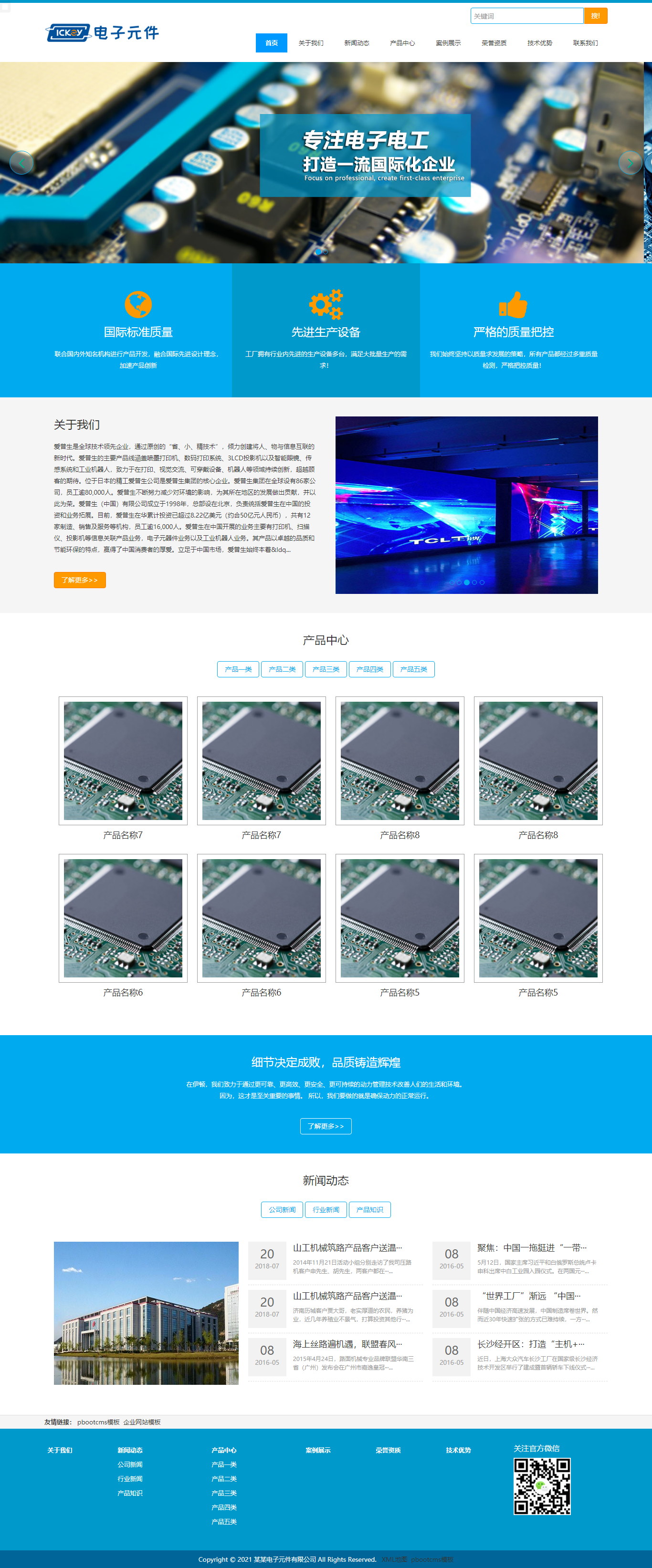 PbootCMS内核开发的网站模板,该模板适用于电子元件设备制造等企业,当然其他行业也可以做,只需要把文字图片换成其他行业的即可;