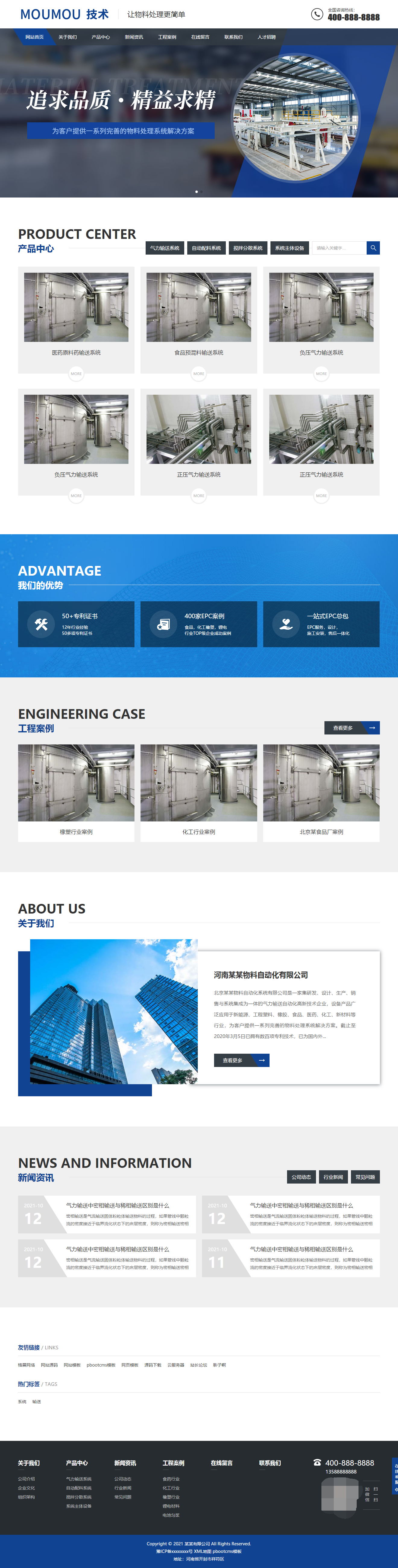 (自适应手机版)响应式物料自动化机械加工类网站pbootcms模板 html5蓝色营销型机械设备网站源码下载PbootCMS内核开发的网站模板,该模板适用于营销型网站、机械设备网站等企业,当然其他行业也可以做,只需要把文字图片换成其他行业的即可;