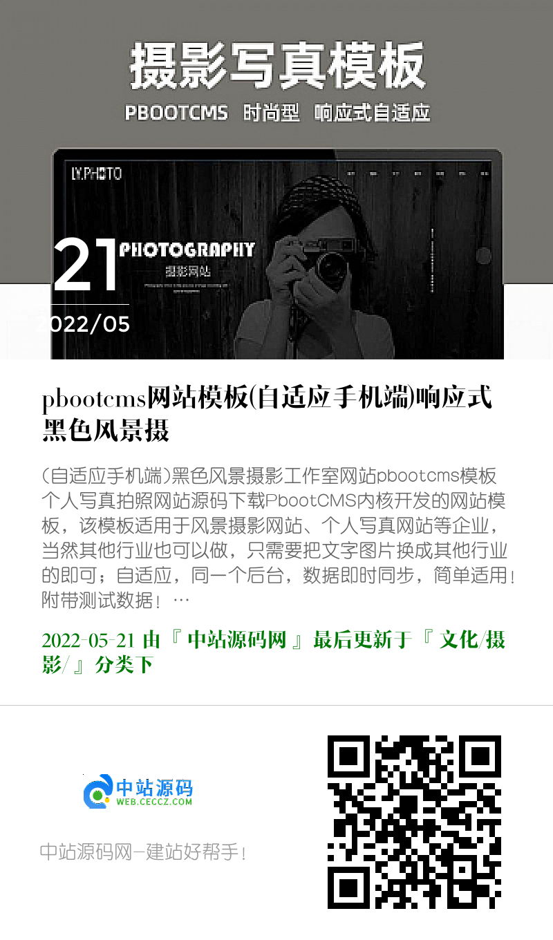 中站源码网-网络情报局 文化/摄影/广告/传媒 pbootcms网站模板(自适应手机端)响应式黑色风景摄影工作室网站pbootcms模板 个人写真拍照网站源码下载 https://web.ceccz.com/cmsmb/pbootcms/wh/720.html