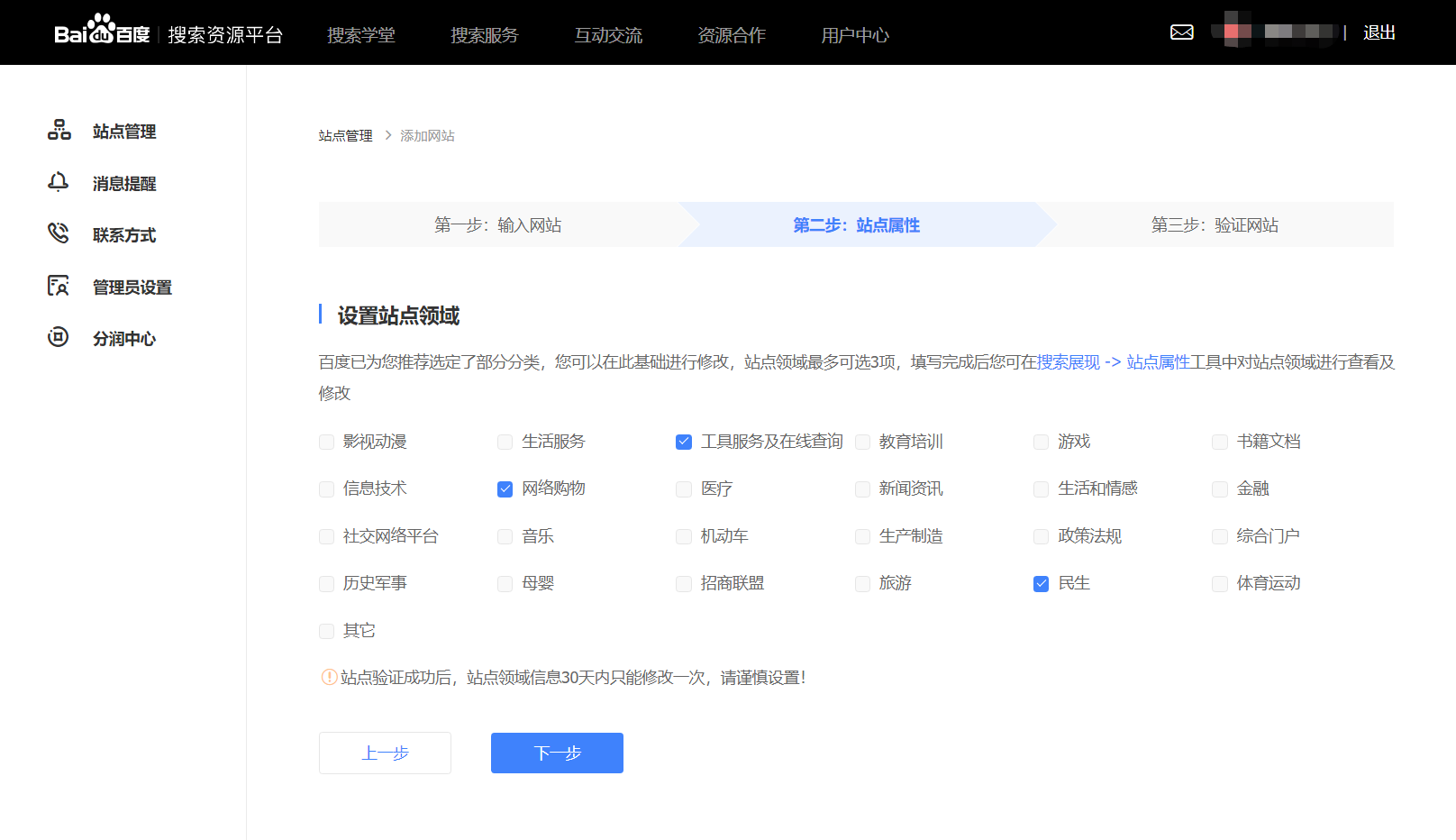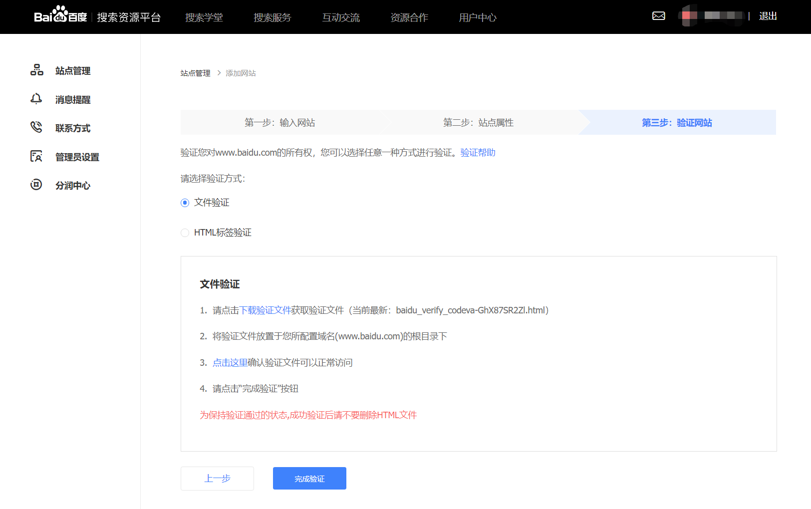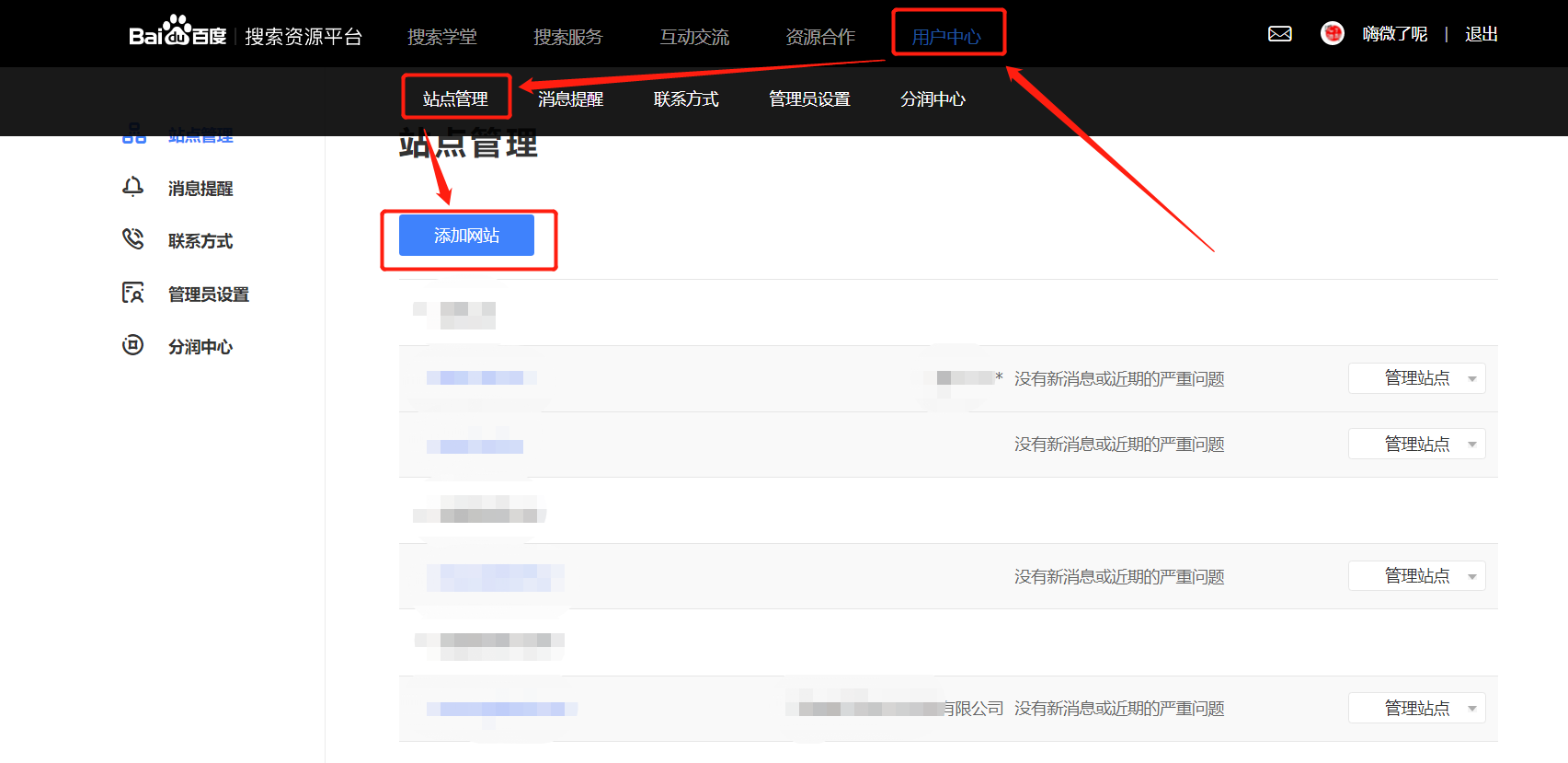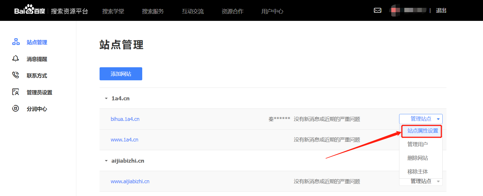 7、找到刚添加验证好的网站,点开 站点属性设置