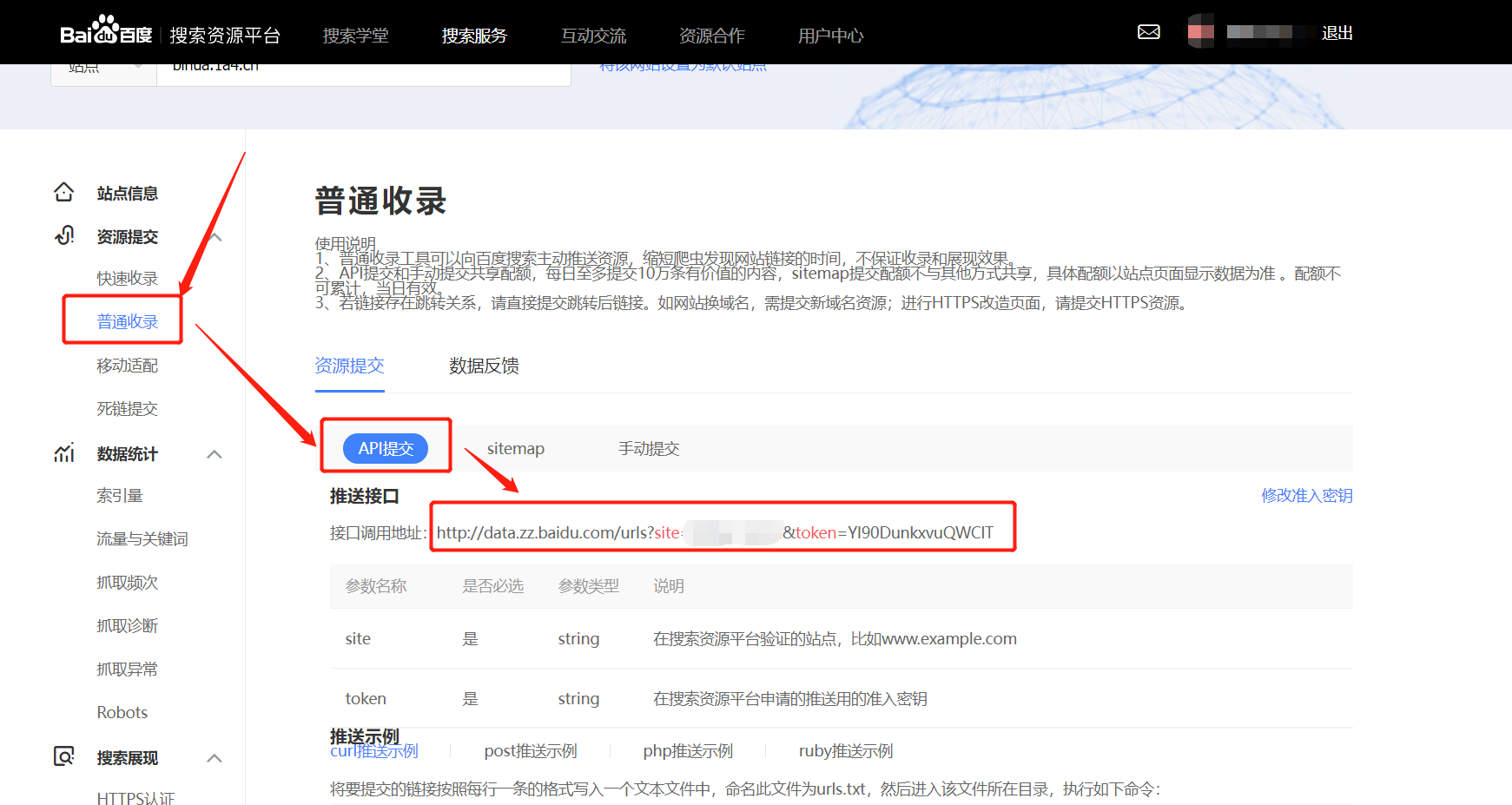 8、左边菜单——普通收录——api提交——接口调用地址 就是要用到的api