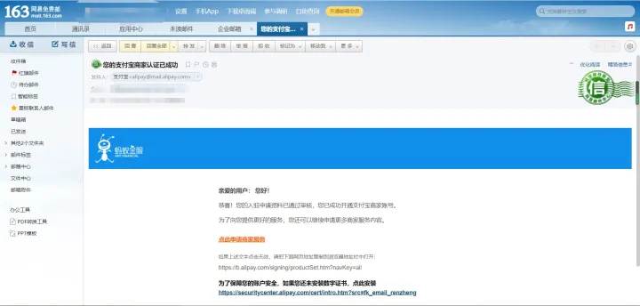 2.支付宝企业版。进入后用邮箱注册申请。什么邮箱都可以最好用QQ或者163/126等邮箱