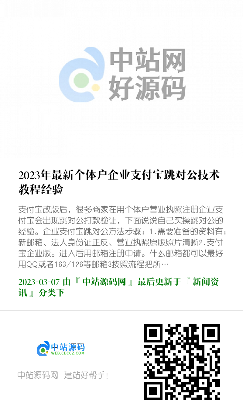 中站源码网-网络情报局 新闻资讯 2023年最新个体户企业支付宝跳对公技术教程经验 https://web.ceccz.com/news/3590.html